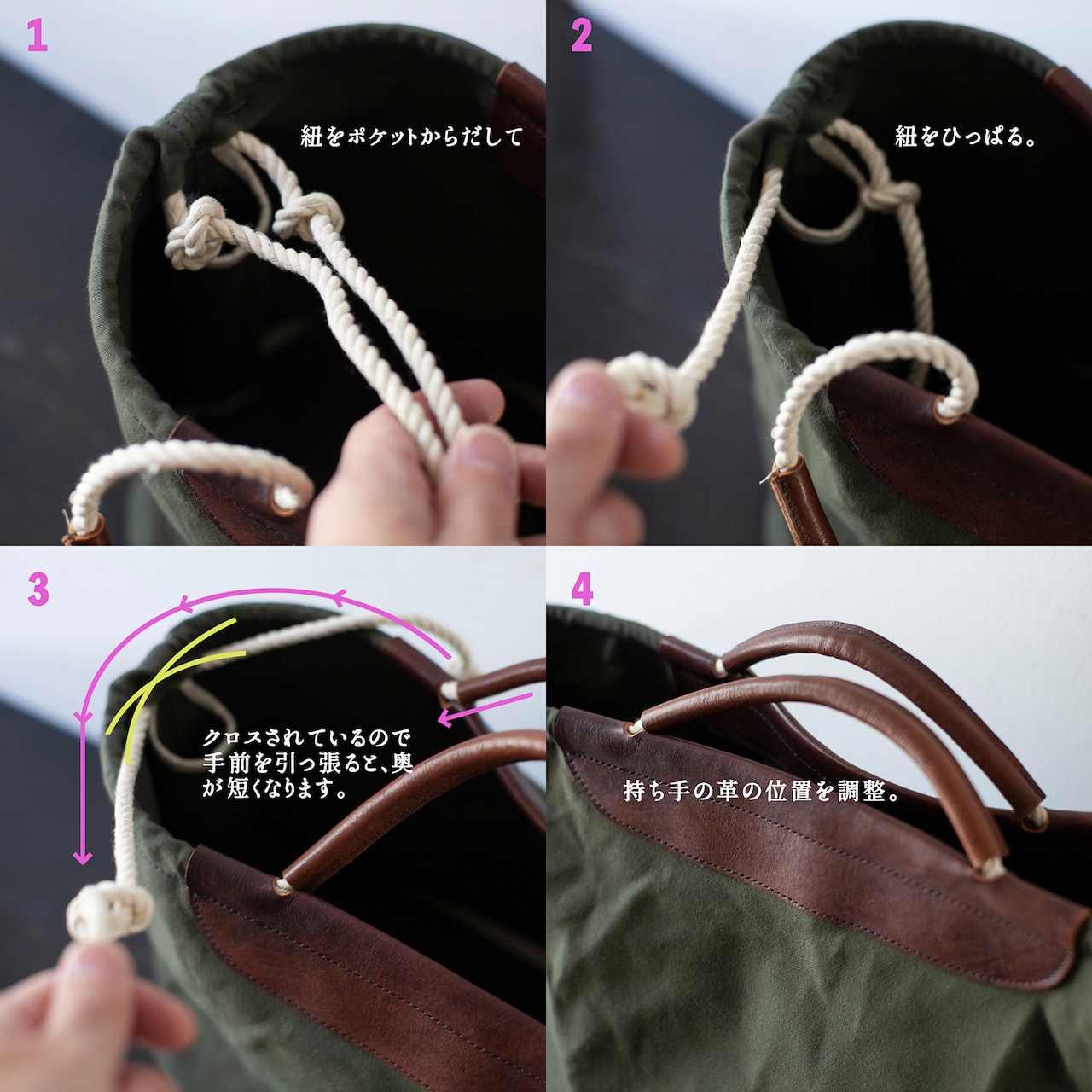ハンドルの長さが調整できるトートバッグ。
