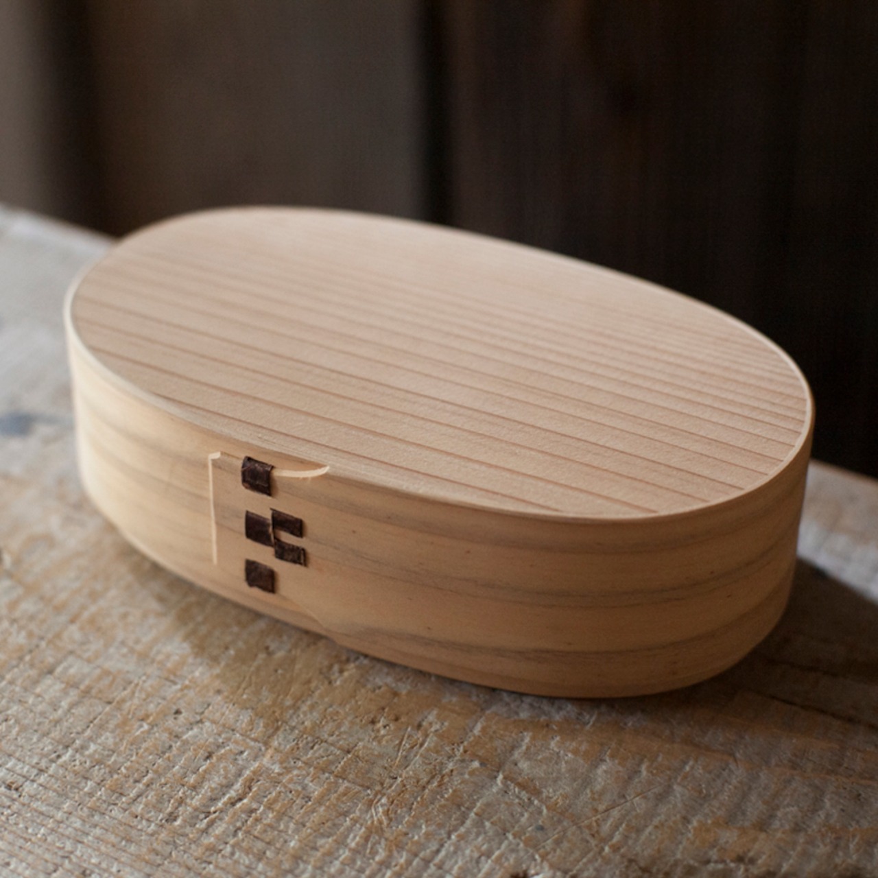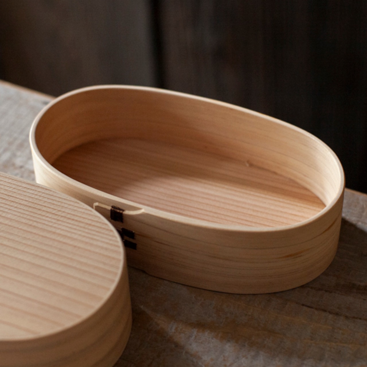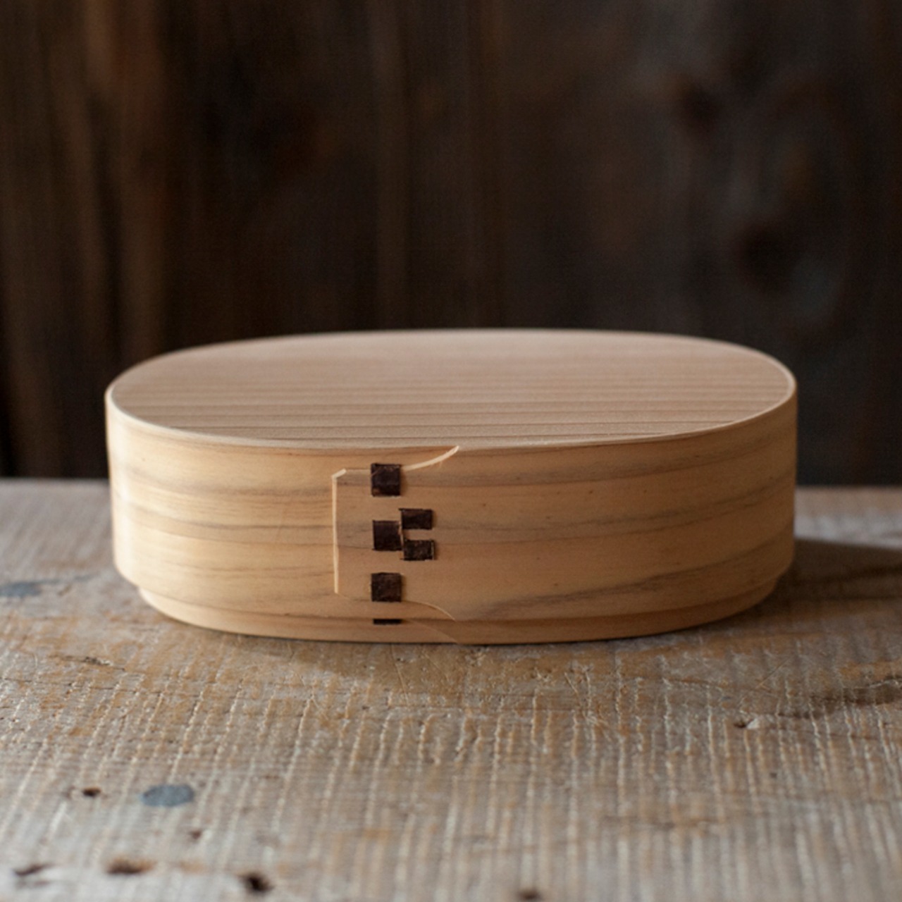 木樵(きこり)が愛用していた曲げ輪の弁当箱を