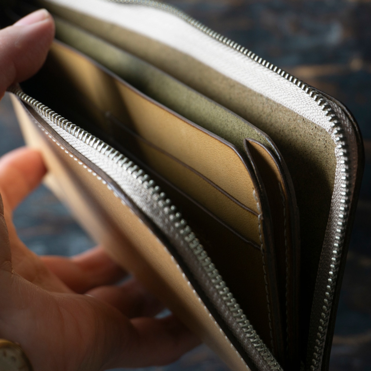 ご使用いただくことで手の油分が入り、革が馴染んでいきます。手の油分だけで十分な場合もありますが、乾燥した箇所にはオイルやワックスを塗布して頂くと、長くお使いいただけます。革に水分がついてしまった場合は、濡れた部分の周りを少し湿らせたタオルでぼやかすことでシミが目立たなくなります。