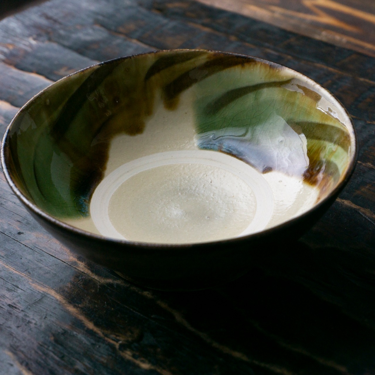 からや窯 登川均 浅鉢 6寸 緑/飴 9